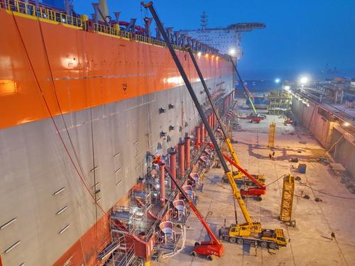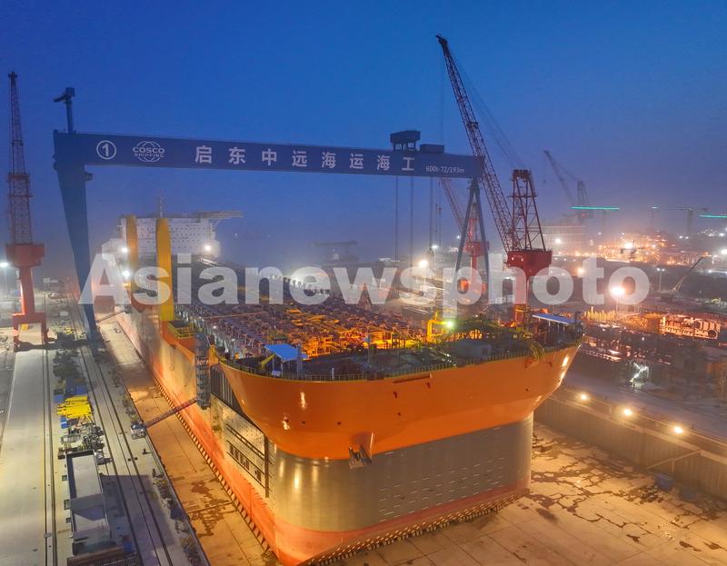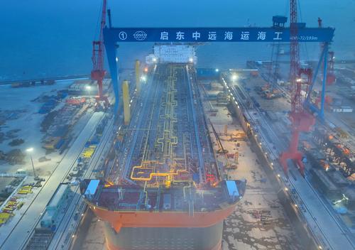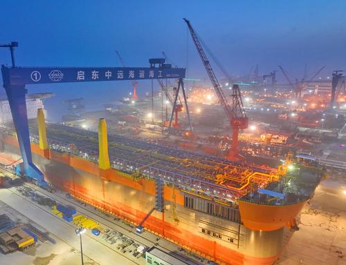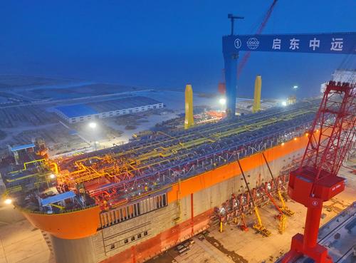 2023年4月17日夜间,在江苏启东中远海运海工船坞中,世界最大吨位级新型海上浮式生产储卸油船挑灯夜战建造忙。