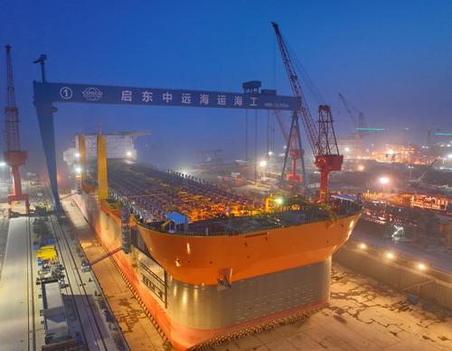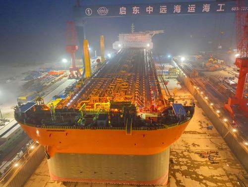 2023年4月17日夜间,在江苏启东中远海运海工船坞中,世界最大吨位级新型海上浮式生产储卸油船挑灯夜战建造忙。预计6月底完成舷外钢结构安装后出坞,进行后续的模块吊装及集成工作。