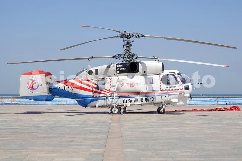 图片说明:2023年4月16日,装载灭火吊桶的卡-32直升机在山东烟台一处临时起降点待命。
