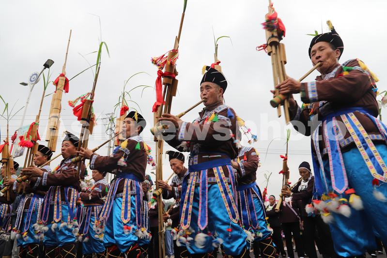 2023年4月18日,在湖南省怀化市通道侗族自治县牙屯堡镇大戊梁歌会现场,侗族群众在吹奏芦笙。