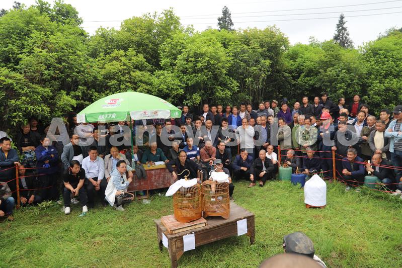 2023年4月18日,在湖南省怀化市通道侗族自治县牙屯堡镇大戊梁歌会现场,侗族群众在斗鸟。