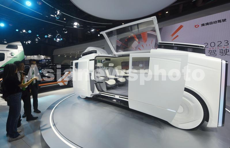 图片说明:2023年4月18日,观众在2023上海车展上参观滴滴自动驾驶首款未来服务概念车DiDi Neuron。