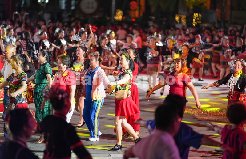 2023年4月17日,在五指山市通什镇的三月三广场,成百上千人跳起共同舞,欢庆海南黎族苗族传统节日“三月三”。据了解,五指山市千人共同舞活动持续至4月20日。