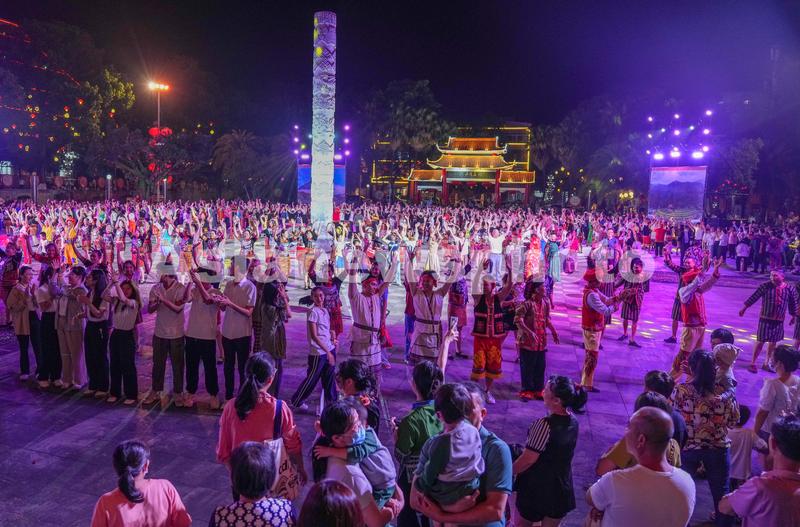 2023年4月17日,在五指山市通什镇的三月三广场,成百上千人跳起共同舞,欢庆海南黎族苗族传统节日“三月三”。据了解,五指山市千人共同舞活动持续至4月20日。
