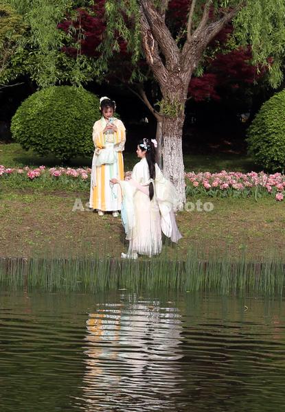 图片说明:2023年4月16日,上海,浦东郊野公园“上海鲜花港”举办郁金香花展,穿汉服的美女取景拍照,记录下自己与春天大自然的和谐生态环境。
