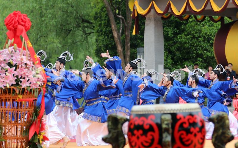 图片说明:4月20日,农历谷雨,2023年公祭大禹陵典礼在浙江省绍兴市大禹陵广场举行,祭祀仪式正在进行献祭舞。