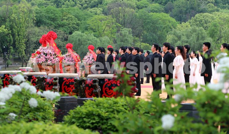 图片说明:4月20日,农历谷雨,2023年公祭大禹陵典礼在浙江省绍兴市大禹陵广场举行,青少年正在诵唱《大禹纪念歌》。