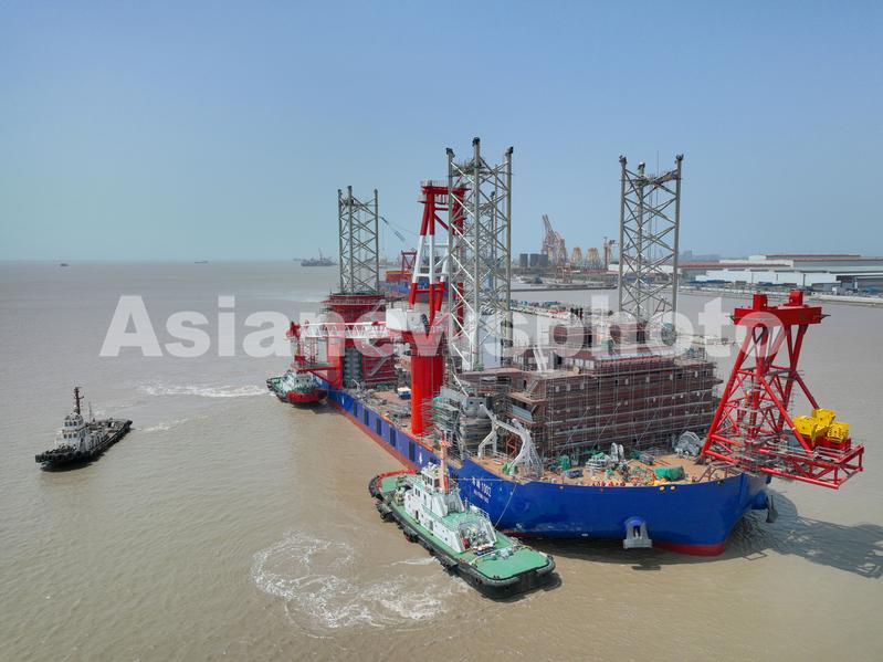 2023年4月21日, 由振华重工为中交海峰风电建造的1800吨海上风电安装平台在振华重工启东海工顺利下水出坞。