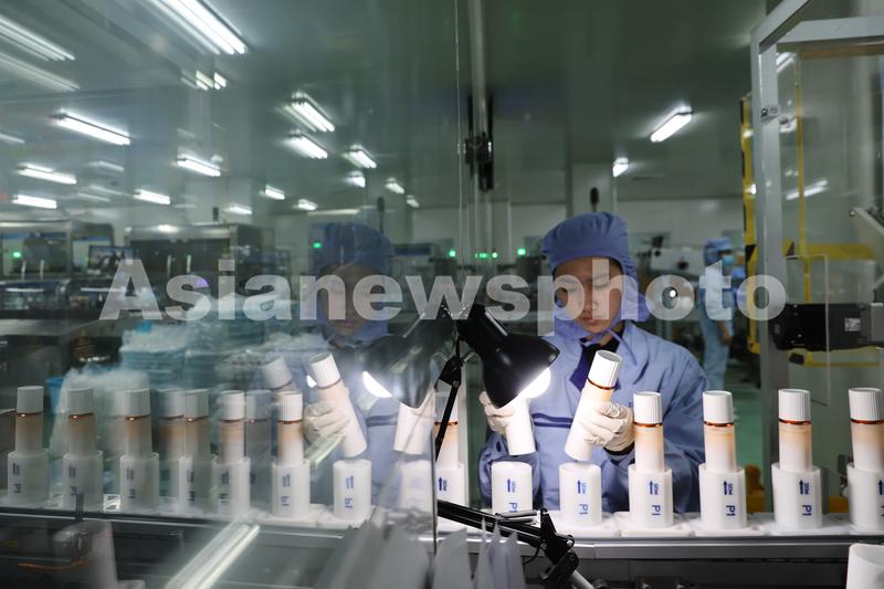 4月25日,在浙江省湖州市吴兴区埭溪镇美妆小镇的一家化妆品生产企业,工人们在流水线上作业。