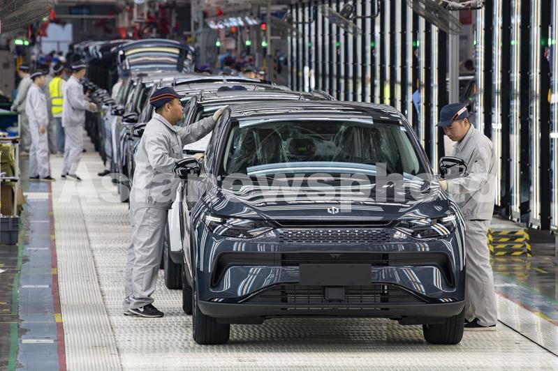 2023年4月26日,浙江省金华新能源汽车小镇零跑汽车智能工厂车间里,新能源汽车正有序下线。