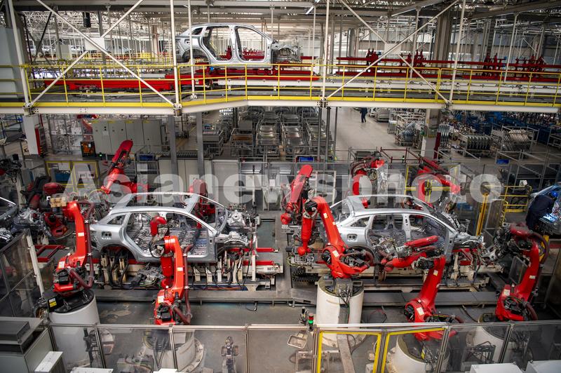 2023年4月26日,浙江省金华新能源汽车小镇零跑汽车智能工厂车间里,智能化新能源汽车生产线一片忙碌。