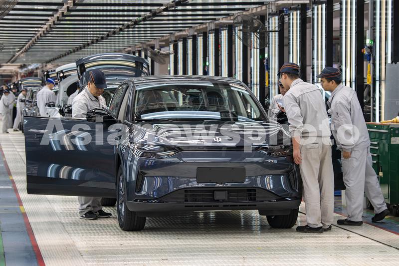 2023年4月26日,浙江省金华新能源汽车小镇零跑汽车智能工厂车间里,新能源汽车正有序下线。