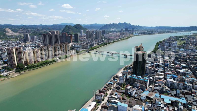 图片说明:4月25日,拍摄的融江广西柳州市融安县城段“泾渭分明”景观。(航拍)