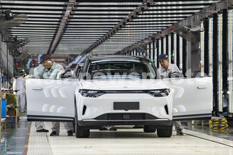 2023年4月26日,浙江省金华新能源汽车小镇零跑汽车智能工厂车间里,新能源汽车正有序下线。