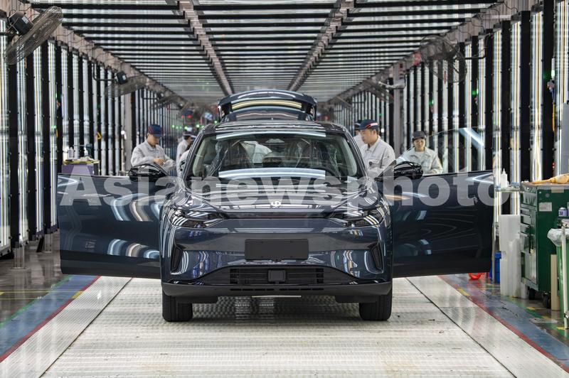 2023年4月26日,浙江省金华新能源汽车小镇零跑汽车智能工厂车间里,新能源汽车正有序下线。