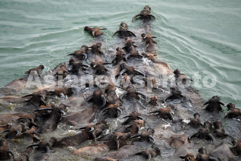 图片说明:4月26日,四川省南充市蓬安县相如街道油房沟社区,百余头水牛横渡嘉陵江上岛吃草。