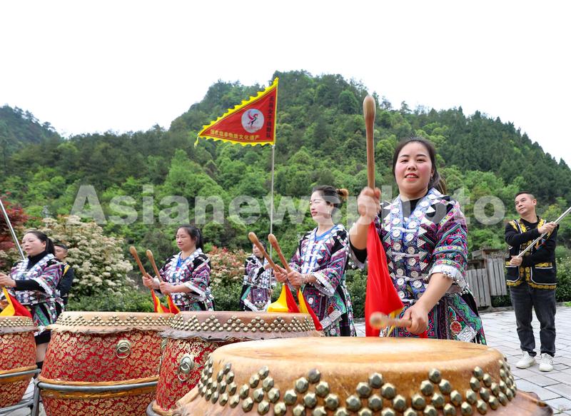 2023年4月27日,民间艺人在位于贵州省黔东南苗族侗族自治州岑巩县天马镇的玉门洞景区表演“思州战鼓”。