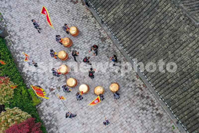2023年4月27日,民间艺人在位于贵州省黔东南苗族侗族自治州岑巩县天马镇的玉门洞景区表演“思州战鼓”(无人机照片)。