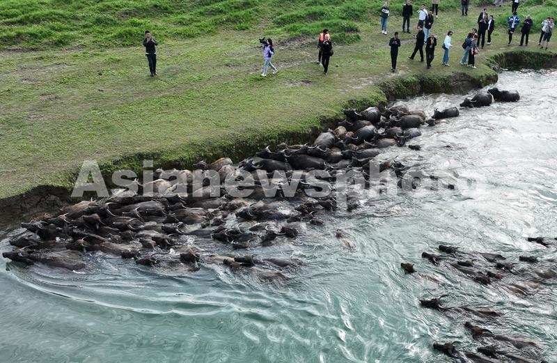 组图说明:2023年4月25日,四川省南充市蓬安县相如街道油房沟社区,百余头水牛从江心岛游回归栏。4月26日,四川省南充市蓬安县相如街道油房沟社区,百余头水牛横渡嘉陵江上岛吃草,引游客围观。