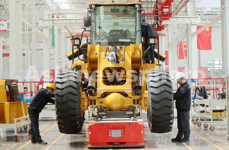 图片说明:2023年4月27日,在浙江省湖州市吴兴高新区的三一装载机智能制造基地,工人在检测装载机。