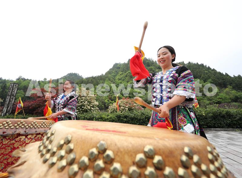 2023年4月27日,民间艺人在位于贵州省黔东南苗族侗族自治州岑巩县天马镇的玉门洞景区表演“思州战鼓”。
