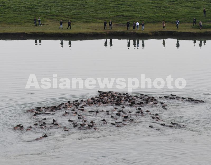 图片说明:4月26日,四川省南充市蓬安县相如街道油房沟社区,百余头水牛横渡嘉陵江上岛吃草,引游客围观。
