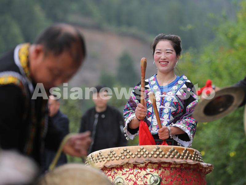 2023年4月27日,民间艺人在位于贵州省黔东南苗族侗族自治州岑巩县天马镇的玉门洞景区表演“思州战鼓”。
