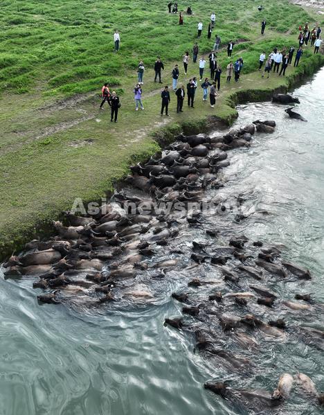 图片说明:4月26日,四川省南充市蓬安县相如街道油房沟社区,百余头水牛横渡嘉陵江上岛吃草,引游客围观。
