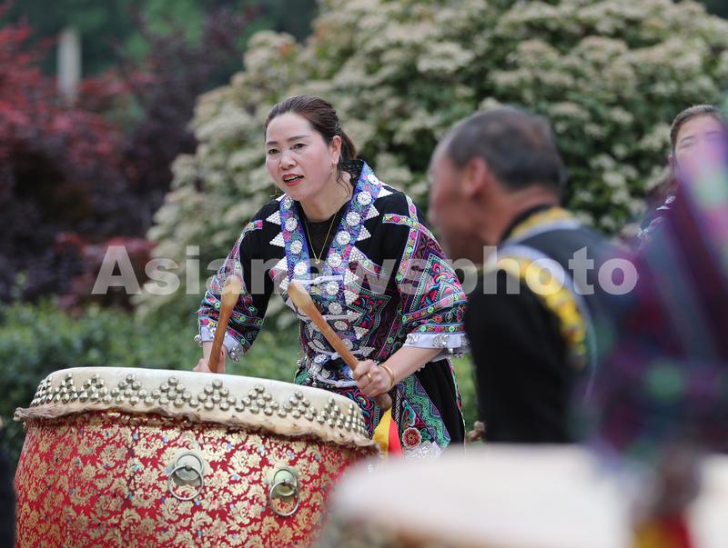 2023年4月27日,民间艺人在位于贵州省黔东南苗族侗族自治州岑巩县天马镇的玉门洞景区表演“思州战鼓”。