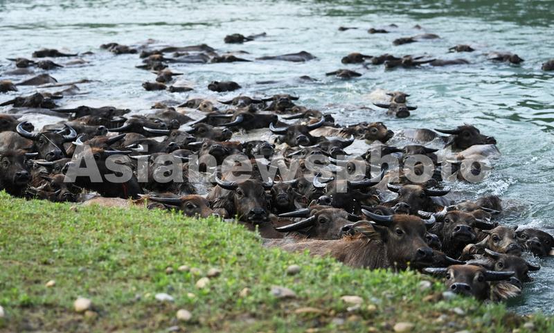 图片说明:4月26日,四川省南充市蓬安县相如街道油房沟社区,百余头水牛横渡嘉陵江上岛吃草,引游客围观。
