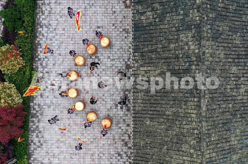 2023年4月27日,民间艺人在位于贵州省黔东南苗族侗族自治州岑巩县天马镇的玉门洞景区表演“思州战鼓”(无人机照片)。