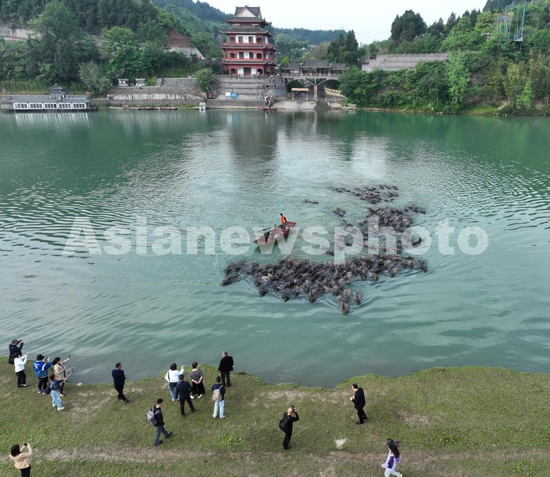 图片说明:4月26日,四川省南充市蓬安县相如街道油房沟社区,百余头水牛横渡嘉陵江上岛吃草,引游客围观。