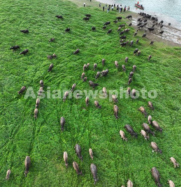 图片说明:4月26日,四川省南充市蓬安县相如街道油房沟社区,百余头水牛横渡嘉陵江上岛吃草。