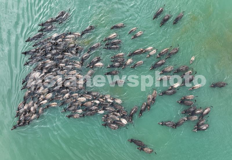 图片说明:4月26日,四川省南充市蓬安县相如街道油房沟社区,百余头水牛横渡嘉陵江上岛吃草。