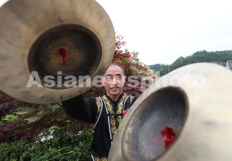 2023年4月27日,民间艺人在位于贵州省黔东南苗族侗族自治州岑巩县天马镇的玉门洞景区表演“思州战鼓”。