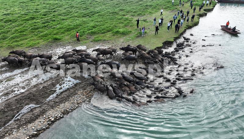 图片说明:4月26日,四川省南充市蓬安县相如街道油房沟社区,百余头水牛横渡嘉陵江上岛吃草,引游客围观。