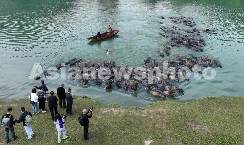 组图说明:2023年4月25日,四川省南充市蓬安县相如街道油房沟社区,百余头水牛从江心岛游回归栏。4月26日,四川省南充市蓬安县相如街道油房沟社区,百余头水牛横渡嘉陵江上岛吃草,引游客围观。