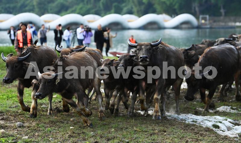 图片说明:4月26日,四川省南充市蓬安县相如街道油房沟社区,百余头水牛横渡嘉陵江上岛吃草,引游客围观。