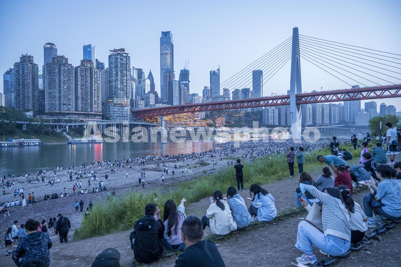 5月1日,重庆市,洪崖洞对岸江滩迎来大批游客,游客如潮人头攒动,人们在此观赏江对岸的洪崖洞景区和山城夜景。