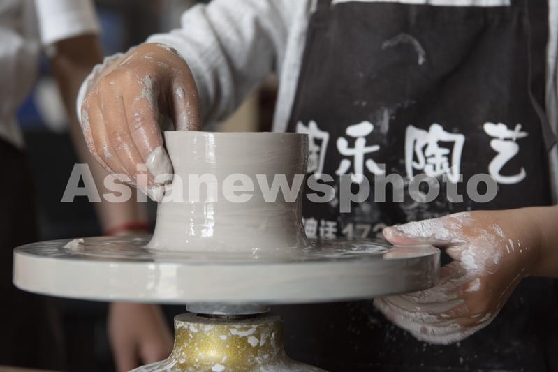 2023年5月2日,孩子们在江苏南通海安市一家陶艺馆内体验陶艺制作。