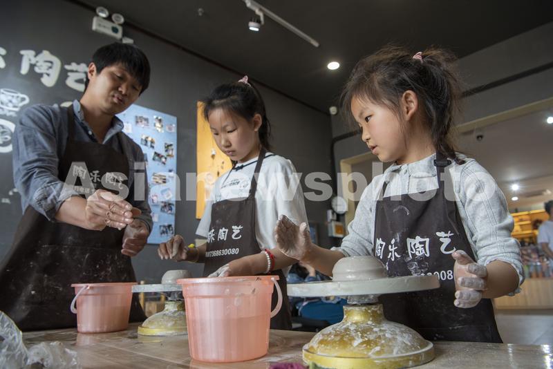 2023年5月2日,孩子们在江苏南通海安市一家陶艺馆内体验陶艺制作。
