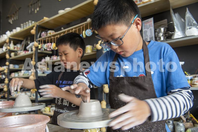 2023年5月2日,孩子们在江苏南通海安市一家陶艺馆内体验陶艺制作。