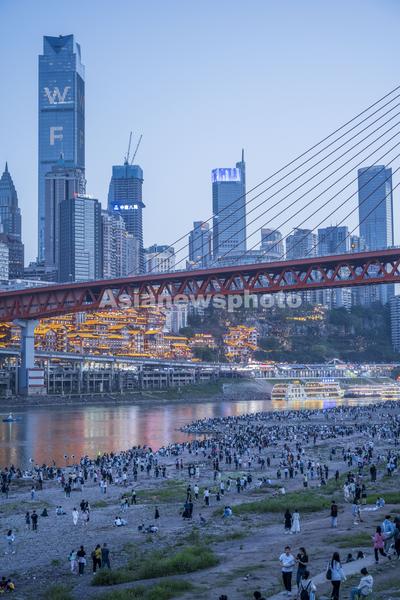 5月1日,重庆市,洪崖洞对岸江滩迎来大批游客,游客如潮人头攒动,人们在此观赏江对岸的洪崖洞景区和山城夜景。