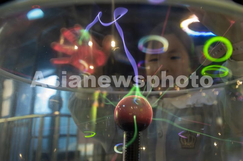 2023年5月2日,一位孩子在江苏南通海安市科普馆体验辉光。