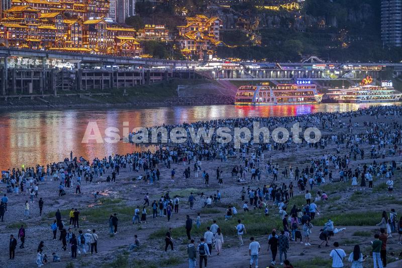 5月1日,重庆市,洪崖洞对岸江滩迎来大批游客,游客如潮人头攒动,人们在此观赏江对岸的洪崖洞景区和山城夜景。