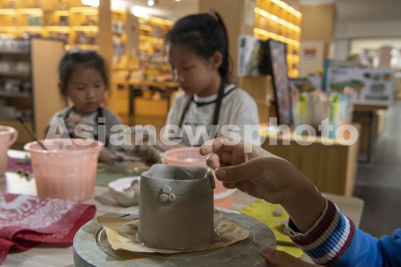 2023年5月2日,孩子们在江苏南通海安市一家陶艺馆内体验陶艺制作。