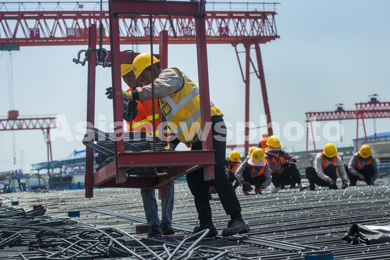 5月1日,中铁上海工程局淮北制梁场工人正在绑扎重达800吨的桥梁钢筋。