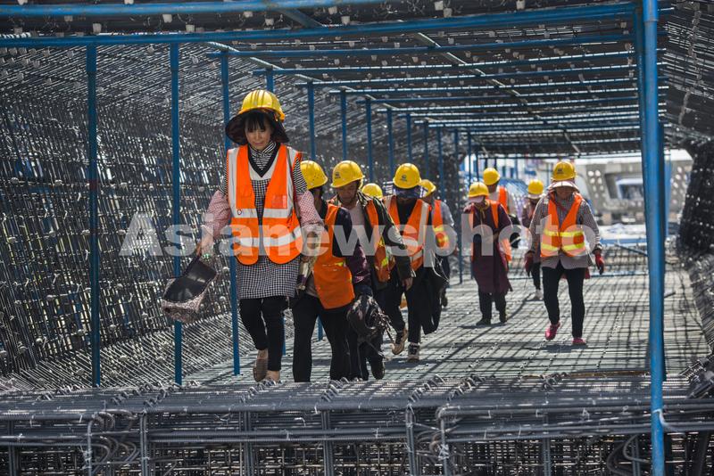 5月1日,中铁上海工程局淮北制梁场工人正在绑扎重达800吨的桥梁钢筋。