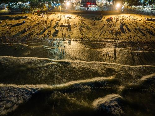图片说明:2023年5月2日晚,在广东省茂名市电白区中国第一滩,络绎不绝的游客和市民在海边冲浪、休闲娱乐。
