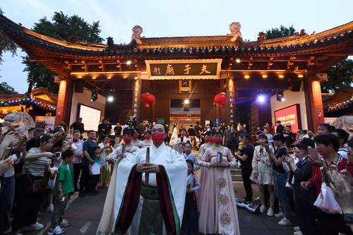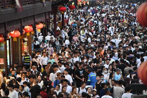 2023年5月2日晚,游客在南京夫子庙景区参观游览。